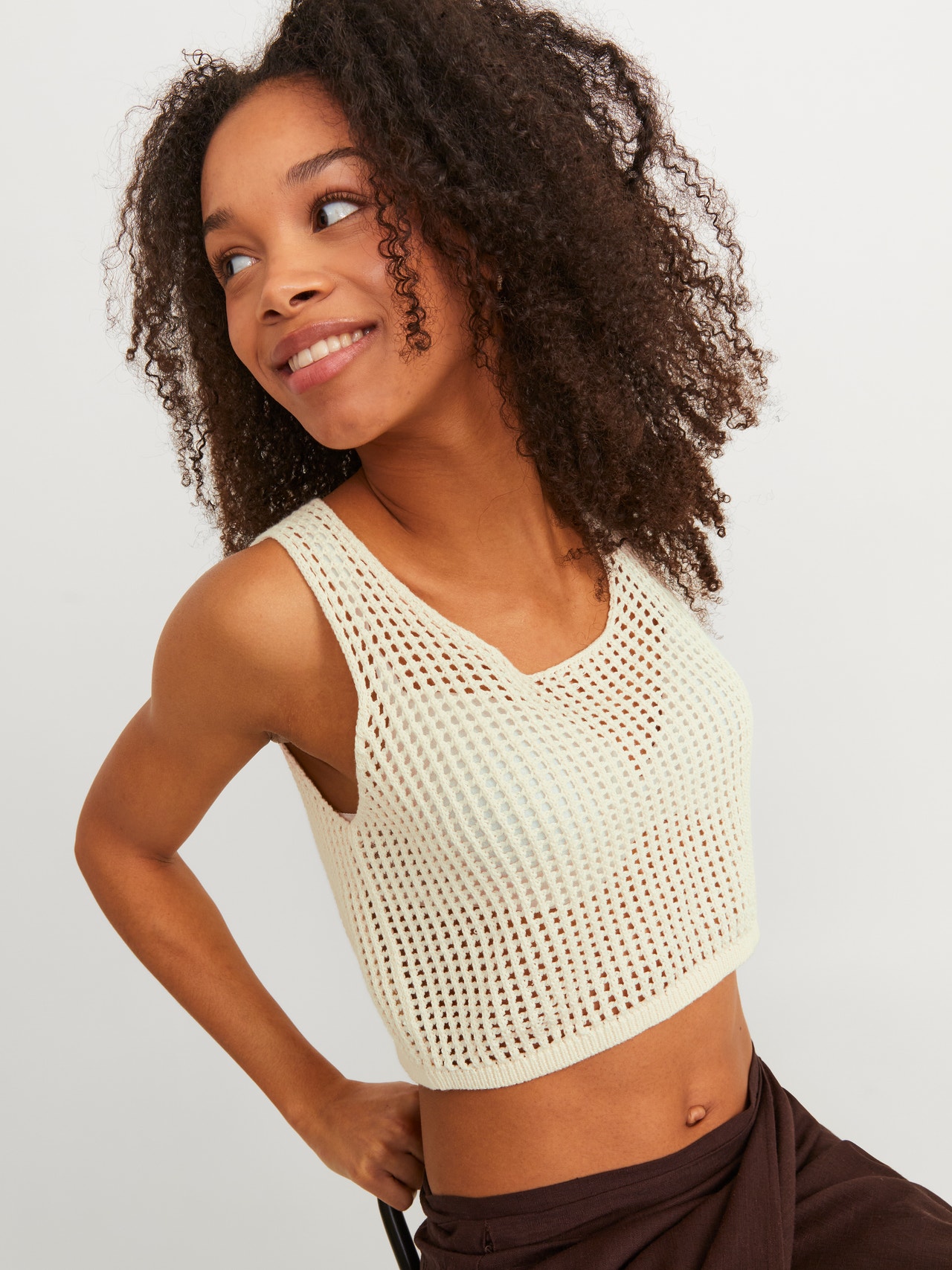Bu, hem hafta sonu jeanle hem de ofiste gömlek ve pantolonun üzerine giyebileceğiniz rahat bir örgü türüdür. Yapılandırılmış örgü, ayrıcalıklı bir görünüm için hafif dokulu olarak üretilmiştir. - Ürün tipi : Örme üst - Boyun : U-Yaka - Kol : Kolsuz - Kalıp : Bol Kalıp