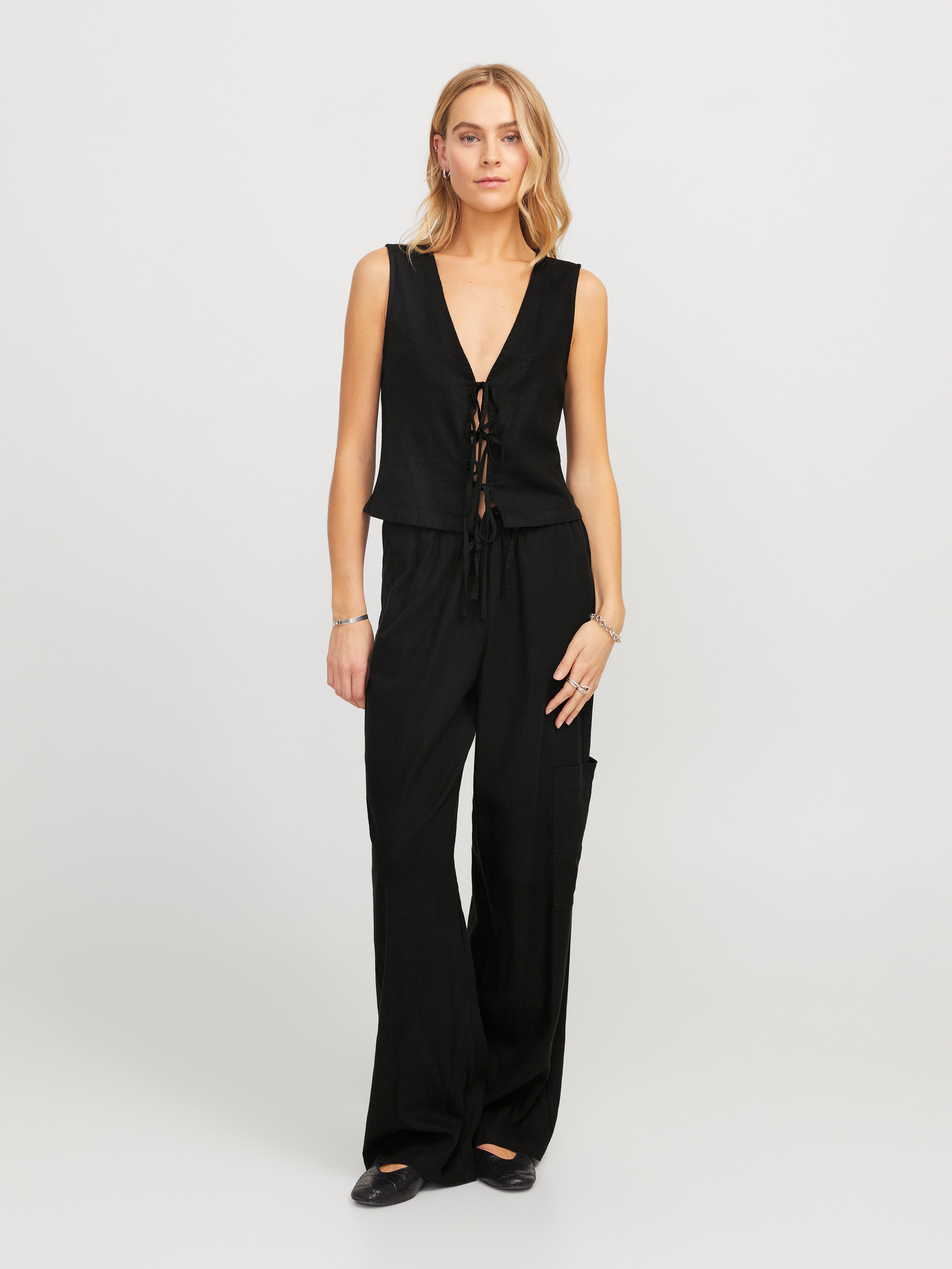 Kadın V Yaka Bağlamalı Keten Yelek - Breeze